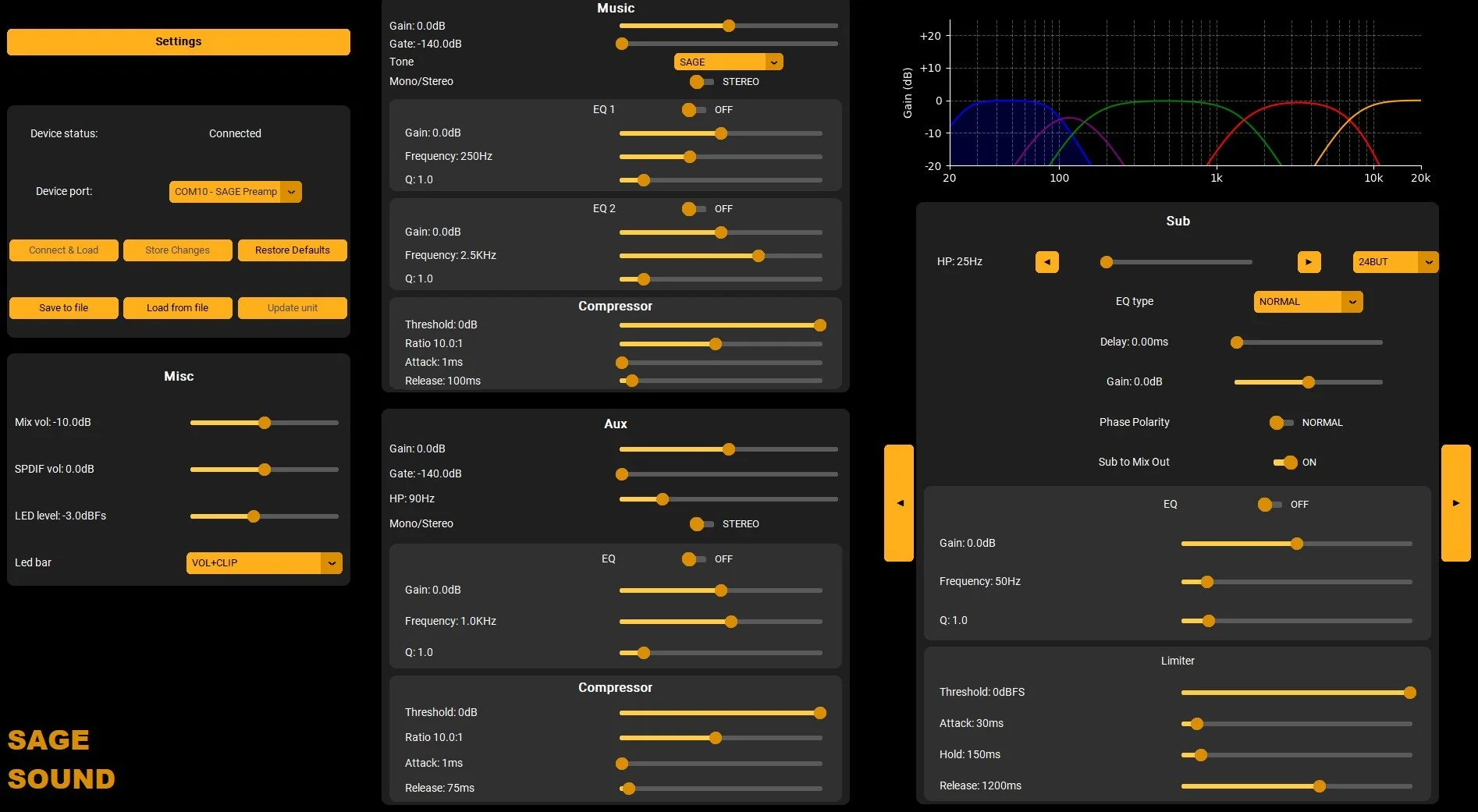 -With the V2 firmware installed you can click the “Select port” button and select the ‘SAGE preamp’ option. Next click the “Connect & Load” button, this will connect the software to the preamp and will load the saved settings, when you see all the settings change it is ready for use.